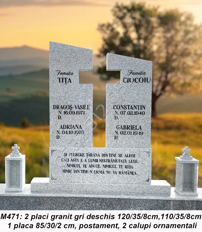 • Cruci marmura sau cruci granit sunt compuse din placa/placi marmura sau granit, postament si doua vaze ornamentale.